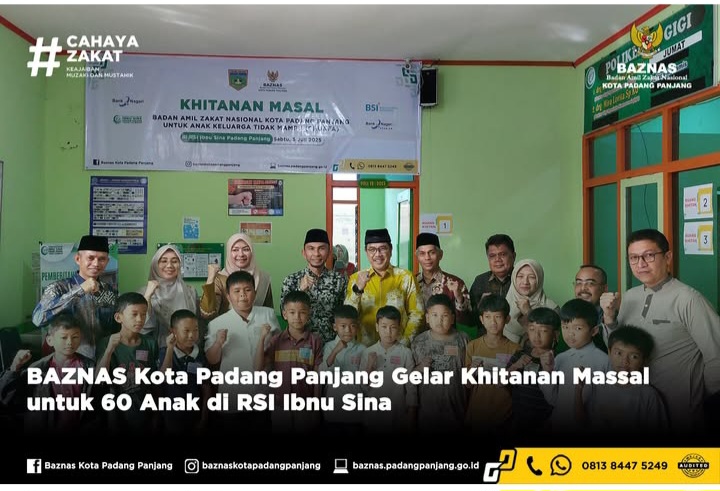 Padang Panjang - Sebanyak 60 anak mengikuti kegiatan khitanan massal yang digelar oleh BAZNAS Kota Padang panjang di rumah sakit islam (RSI) Ibnu sina pada tanggal 5/7/2025 kegiatan ini digelar sebagai bentuk komitmen BAZNAS Kota Padang panjang terhadap kebutuhan masyarakat,khususnya bagi keluarga yang membutuhkan bantuan untuk menjalankan salah satu kewajiban keagamaan anak-anak mereka.